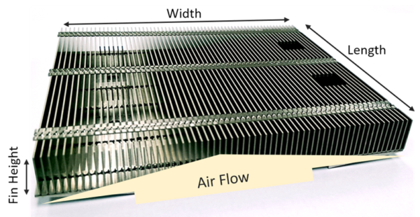 How to use the online heat sink calculator to determine heat sink performance for a thermal solution using a solid metal base compared to a vapor chamber base. Input variables include fin height, fin thickness, heat source power, and heat sink dimensions. Since fin packs (zipper fins) are often used with two-phase devices, they will be used – rather than extruded, machined, bonded, or skived heat sinks.