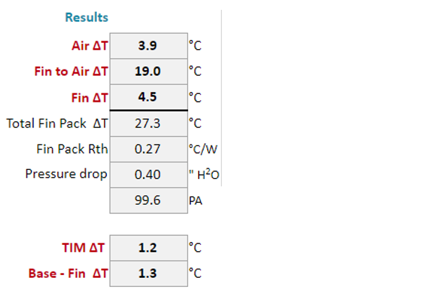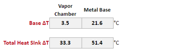 The Results – The first set of delta-ts are common to both the solid metal and vapor chamber base. In this example, we have a total fin pack delta-t of 27.3 oC, and a total TIM and Base to fin delta-t of 2.5 oC.