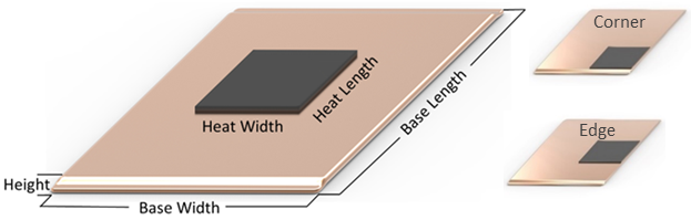 Heat Source Length, Width, and Location – Self-explanatory especially with the provided diagram. Remember that chip location will greatly affect base delta-t for solid metal while its effect on the vapor chamber delta-t is negligible. A general rule of thumb is that vapor chambers become attractive as the ratio of base area to heat source area surpasses 10:1.